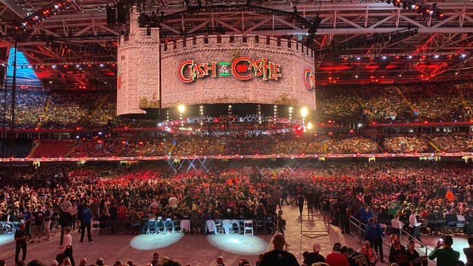 An dieser Stelle gab es auch schon mal einen Einblick in die Gestaltung im Principality Stadium. Während auf eine größere Stage verzichtet worden ist (wie zuletzt bei allen Stadion-Shows außer WrestleMania und in Saudi-Arabien), ist allerdings aus Videoleinwand-Elementen ein großes Castle über dem Ring geformt worden.